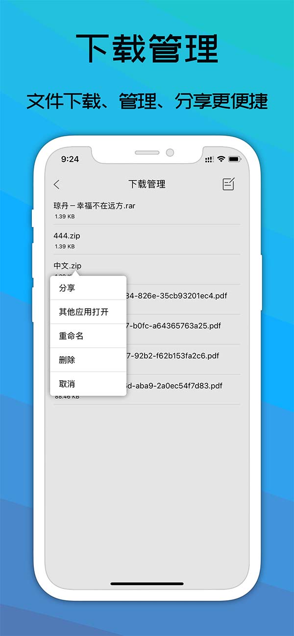 下载管理方便: 可以对下载的文件进行重命名、分享、删除,下载的文件可以通过分享功能传输到阅读器、邮件等应用使用。